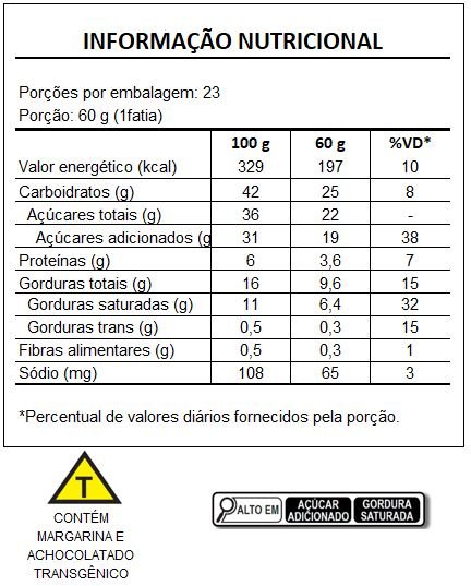 Ingredientes: Leite condensado (leite integral e/ou leite em pó integral reconstituído, açúcar e lactose), creme de leite, creme vegetal tipo chantilly (água, gordura vegetal de semente de palma hidrogenada, açúcar, sal, estabilizantes hidroxipropilmetilcelulose, goma xantana, emulsificantes polisorbato 60, ésteres de ácidos graxos com poliglicerol, lecitina de soja, estearoil lactato de sódio, reguladores de acidez citrato de sódio, fosfato dissódico, aromatizantes, corantes urucum, cúrcuma), achocolatado em pó (Streptomyces viridochromogenes, Bacillus thuringiensis, Agrobacterium tumefaciens, Zea mays), farinha de trigo enriquecida com ferro e ácido fólico, gema de ovo, clara de ovo, açúcar, margarina (Agrobacterium sp., Agrobacterium tumefaciens/Bacillus thuringiensis, Arabidopsis thaliana, Streptomyces viridochromogenes, Zea mays e Sphingobium herbicidorovans), manteiga, chocolate meio amargo e composto lácteo com gordura vegetal.